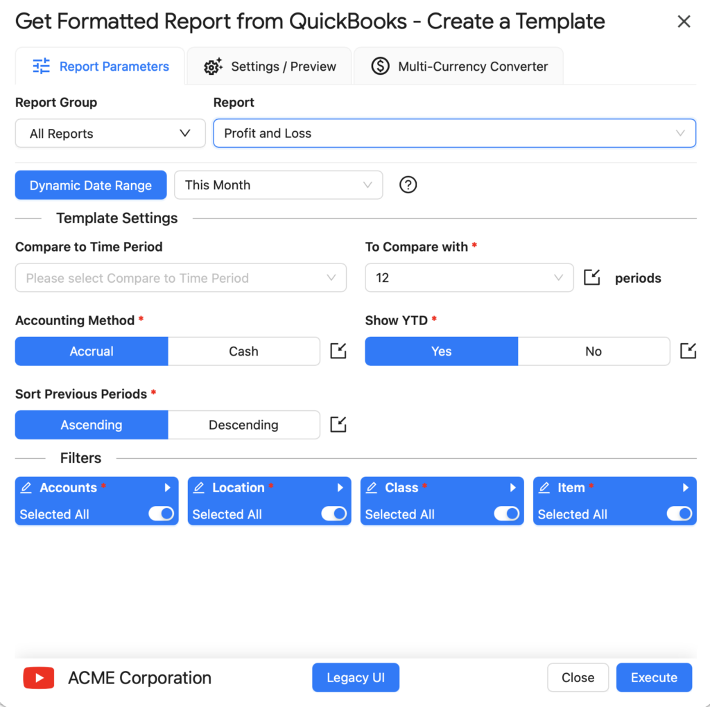 If you need to generate your Profit & Loss report in a currency other than your QuickBooks base currency, the Multi-Currency Converter tab lets you select a target currency and choose how exchange rates are applied.