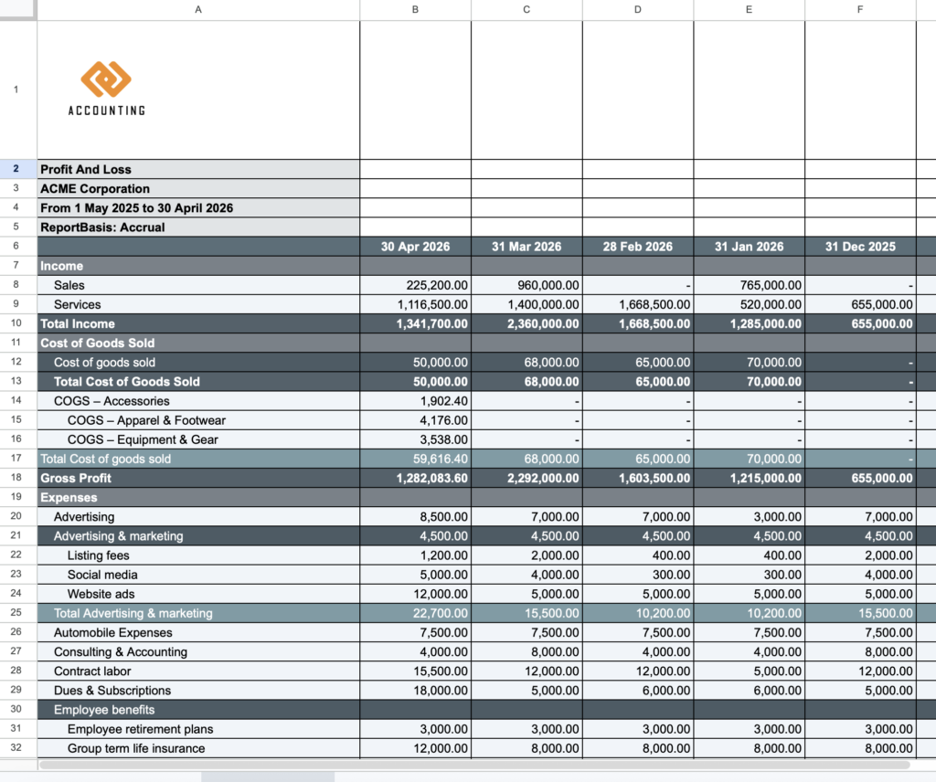 Export your Formatted Profit and Loss report from QuickBooks directly into Google Sheets, with flexible configuration options and automated updates.