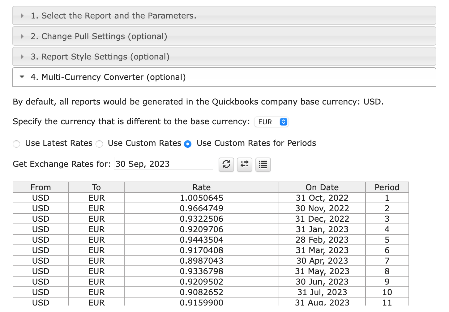 Using Custom Rates: Choose "Use Custom Rates," specify a date, and decide whether to get rates directly or create a separate tab with custom rates. This feature lets you manually adjust exchange rates for the report.
