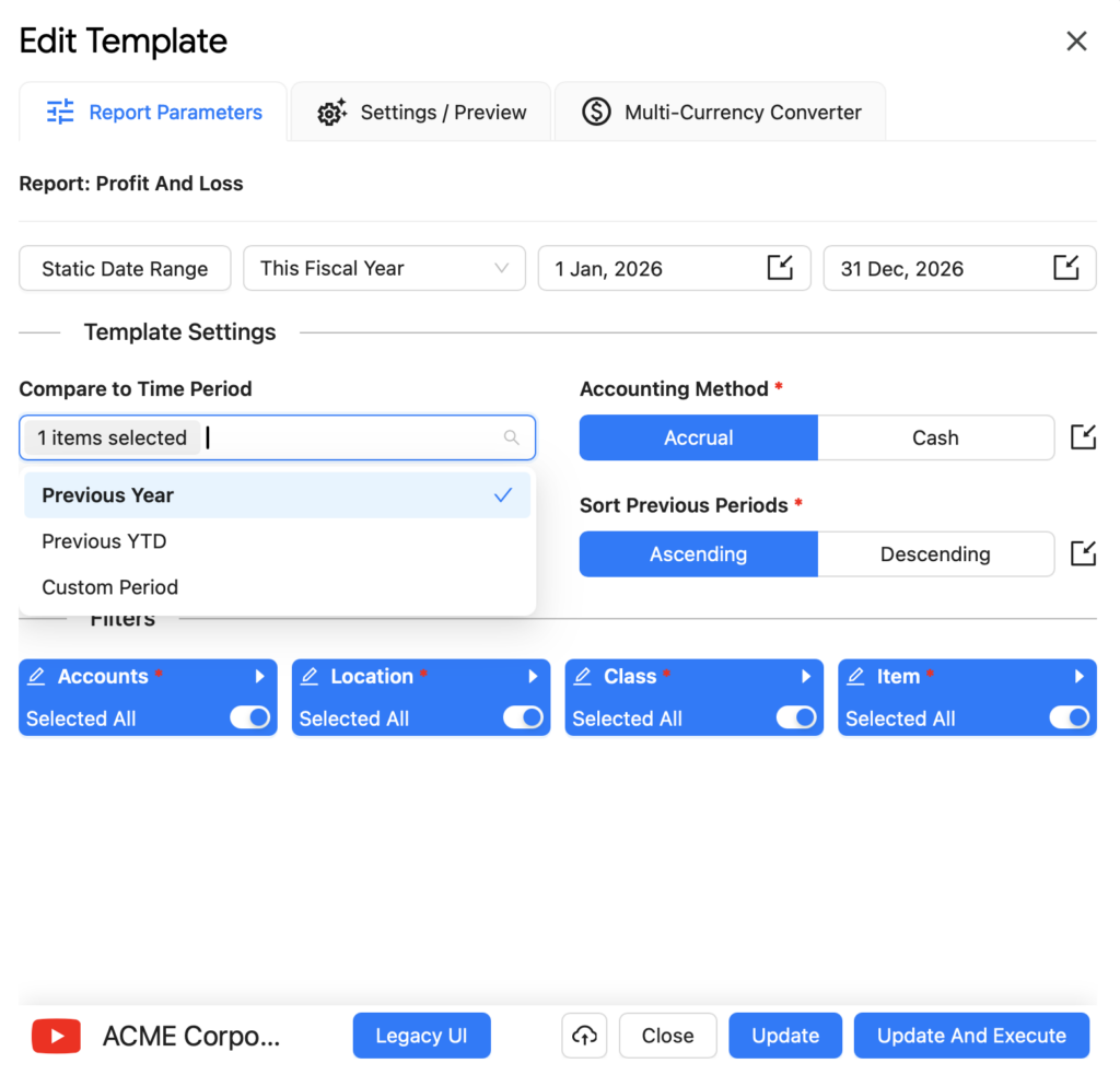 To set it up, open the Edit Template panel, go to Report Parameters, set your date range (e.g. This Fiscal Year), then under Compare to Time Period select Previous Year.