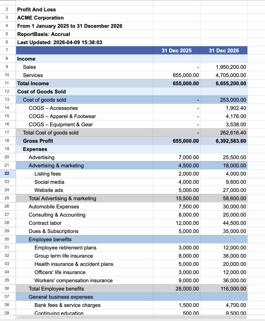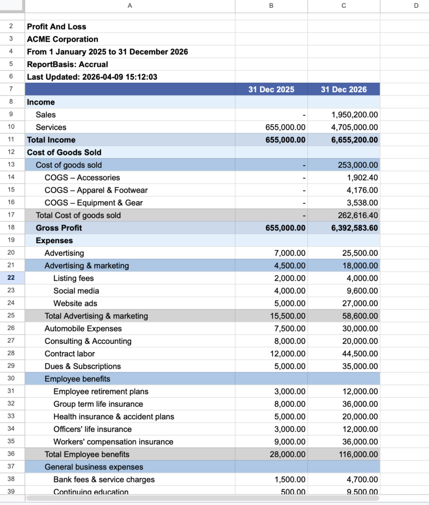 The resulting report in Google Sheets displays two columns side by side โ 31 Dec 2025 and 31 Dec 2026 โ across all P&L line items including Income, Cost of Goods Sold, Gross Profit, and Expenses, making year-over-year movement immediately visible.