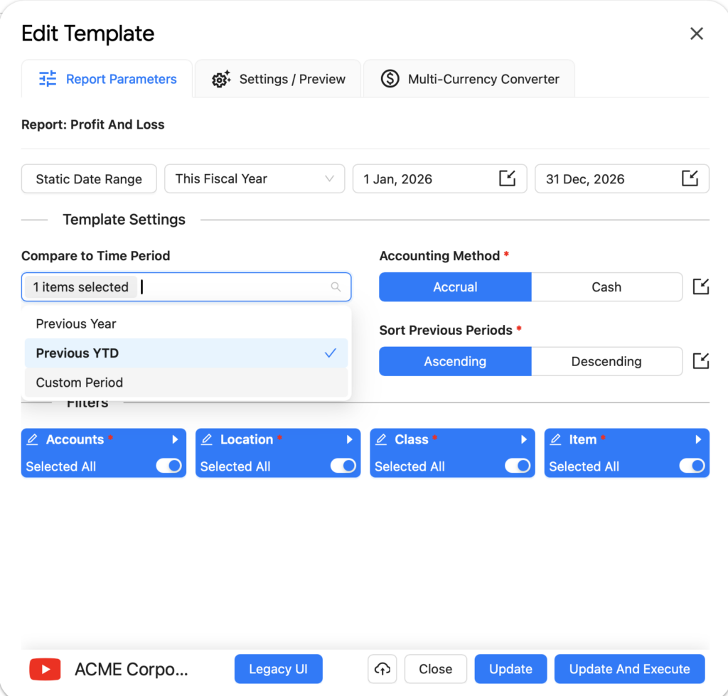 You can define any date range as your "year to date" baseline and compare it against any equivalent prior period โ making this report ideal for multi-entity businesses, grant reporting, project-based accounting, or any scenario where standard fiscal year boundaries don't apply.