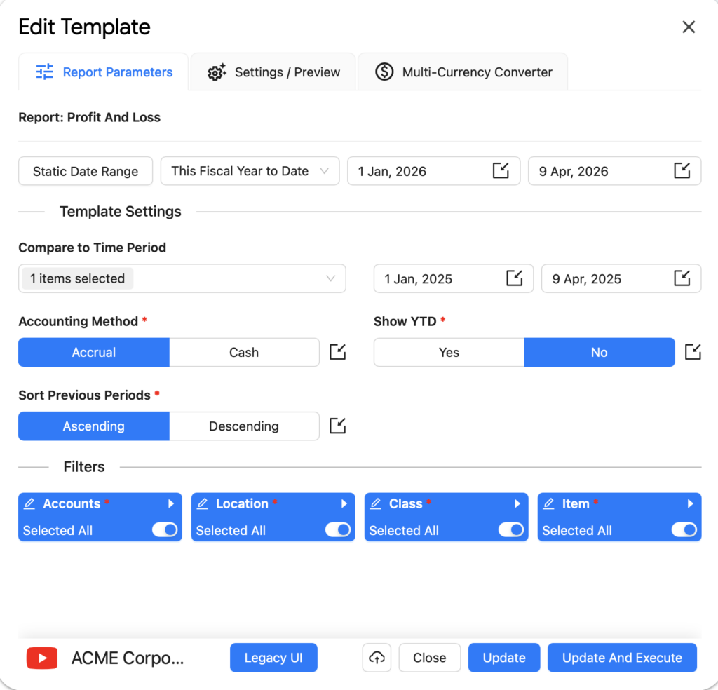 Set the date range to This Fiscal Year to Date (e.g. 1 Janโ9 Apr 2026), then under Compare to Time Period select Previous YTD with a custom comparison window of 1 Janโ9 Apr 2025. A Show YTD toggle lets you control whether the accumulated YTD total is displayed alongside the period columns.