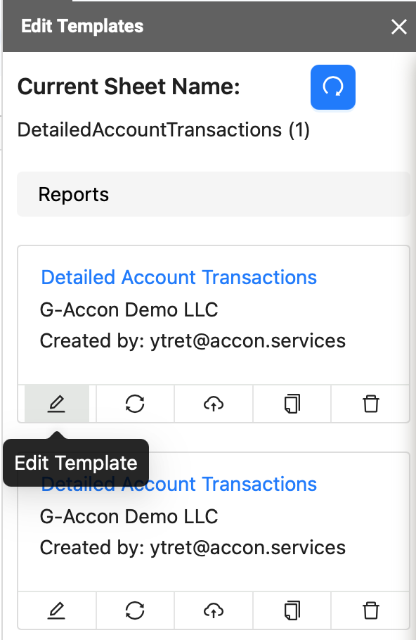 To modify the existing template, users need to select "Edit Template for Current Sheet." This will provide access to the following options: Edit Template, Refresh Template, Create Cloud Template, Duplicate Template, and Delete Template.