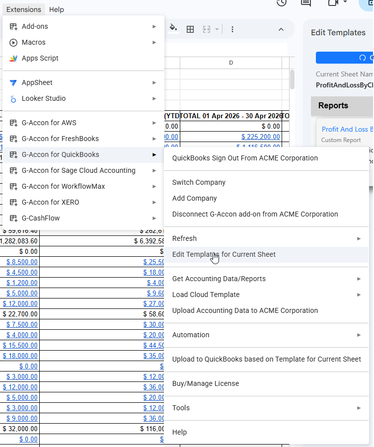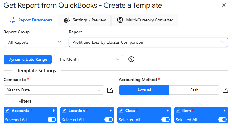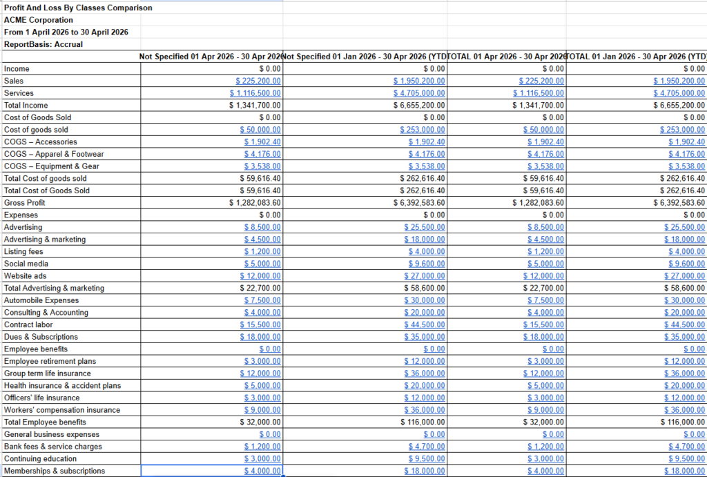 Export Profit And Loss By Classes Comparison Report into Google Sheets