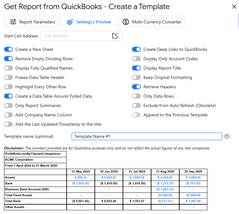 Using Custom Rates: Choose "Use Custom Rates," specify a date, and decide whether to get rates directly or create a separate tab with custom rates. This feature lets you manually adjust exchange rates for the report.