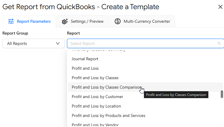 Choose the Profit And Loss By Classes Comparison report from the drop-down menu in Custom Accounting Reports.