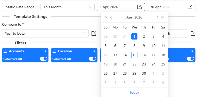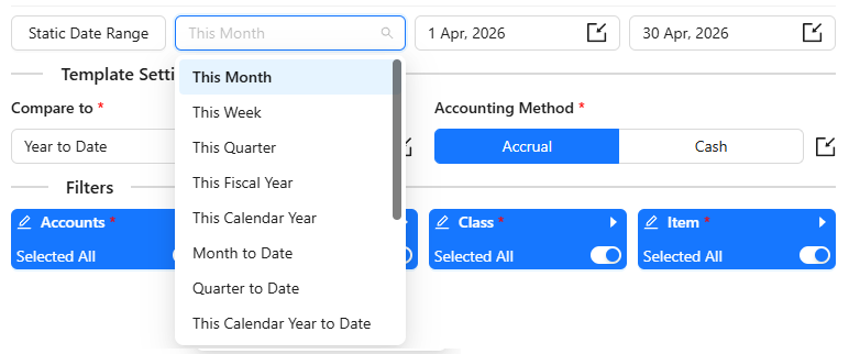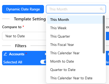 Dynamic Date Range: The report data will be calculated based on pre-populated values like This Month, This Quarter, This Year, Last Month, etc.