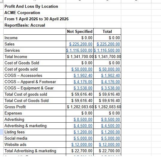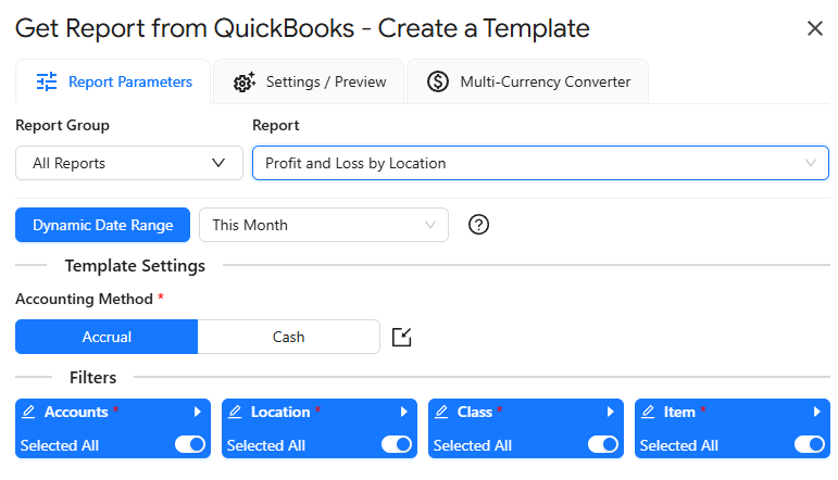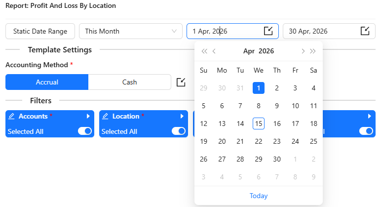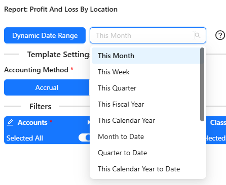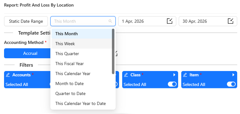 Select the Profit And Loss By Locatios option from the drop-down menu in Custom Accounting Reports.