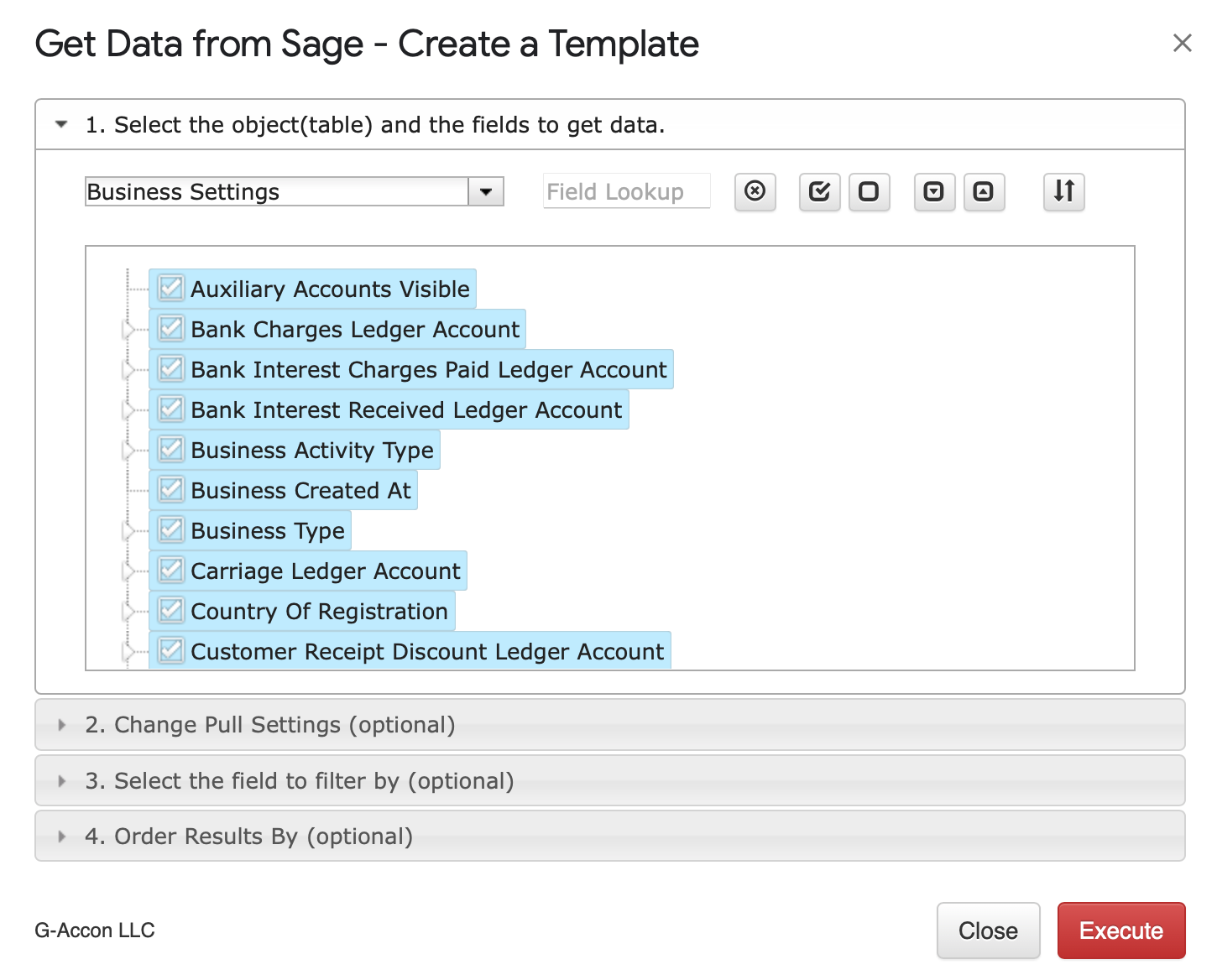 Selectย Business Settings option from the drop down menu. You can select all attributes or some attributes based on your preferences. You can also expend attributes the see the whole structure with sub attributes or collapse it.
