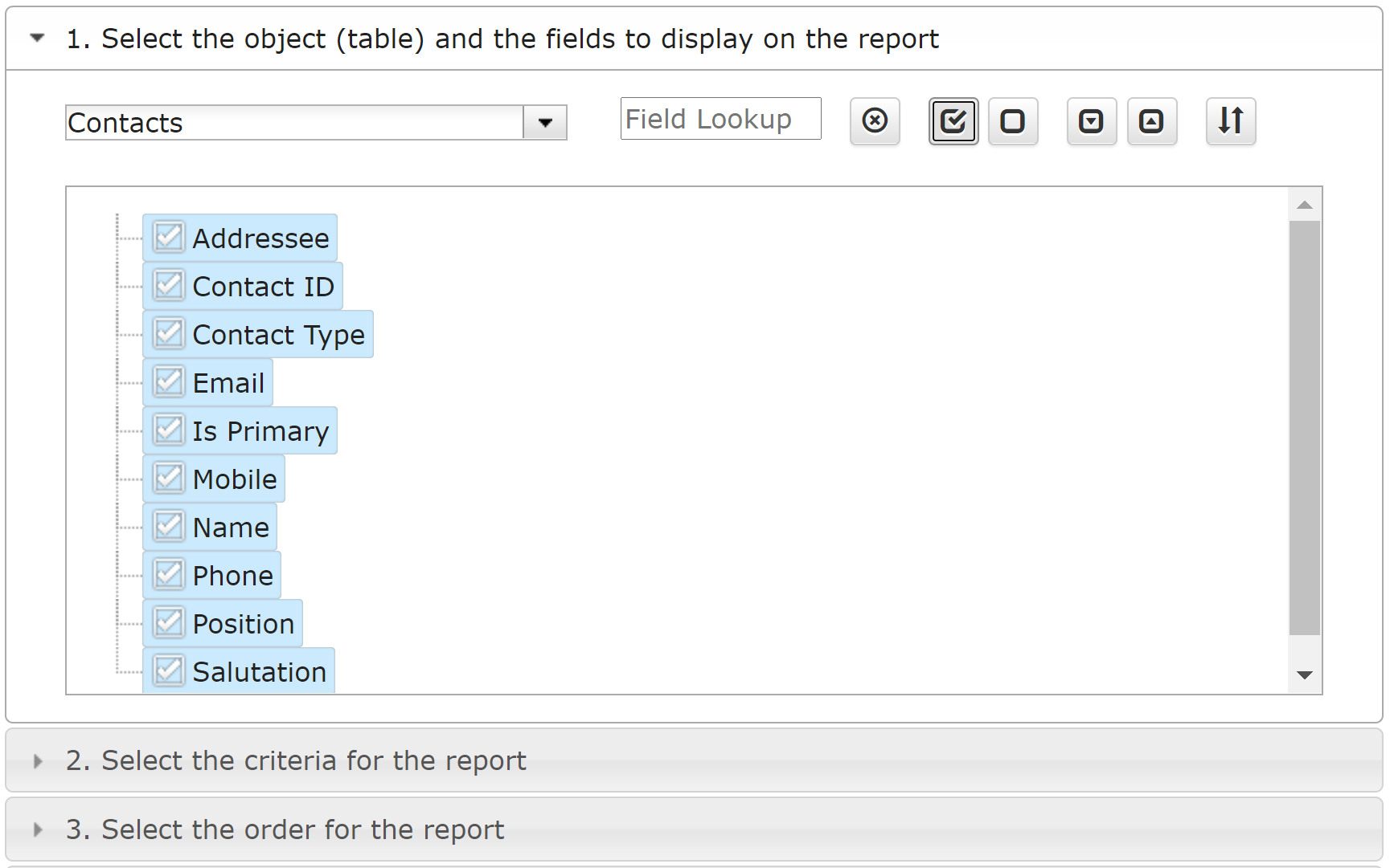 Select Contacts option from the drop down menu. You can select all attributes or some attributes based on your preferences. You can also expend attributes the see the whole structure with sub attributes or collapse it.