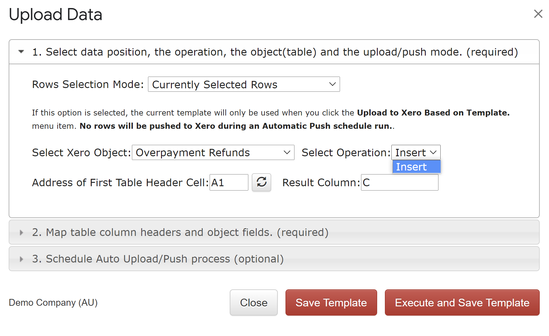 Your next step is to select the Xero table (object) where you want to upload your data. Select the Overpayment Refunds table and choose the operation from the Select Operation drop down box. G-Accon for Xero supports Insert and Update operations. Overpayment Refunds support Insert operations.