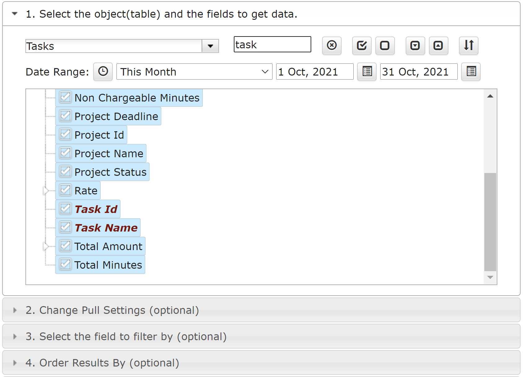 Select Tasks option from the drop down menu. You can select all attributes or some attributes based on your preferences. You can also expend attributes the see the whole structure with sub attributes or collapse it.