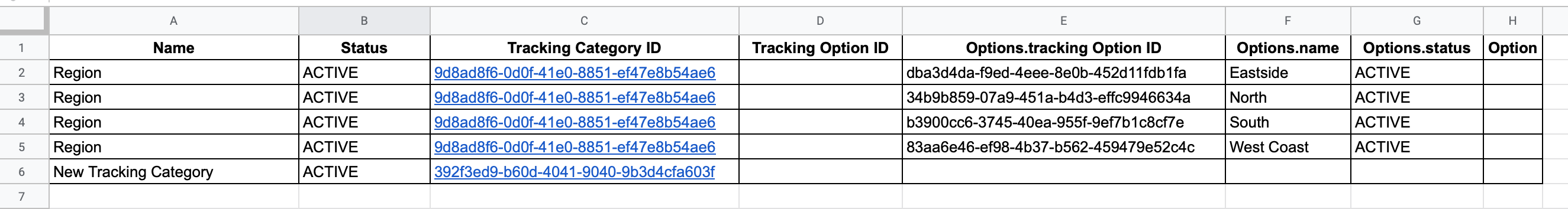 This is one time process. The easiest way to map your data to Xero object fields is to go to Extensions -> G-Accon for Xero -> Reports Designer -> Design Accounting Report, select Tracking Category object (table) from the drop down menu and all attributes which you would like to upload. This gives you the structure that can be easily mapped and post into Xero account. You can select all or some attributes based on your preferences.