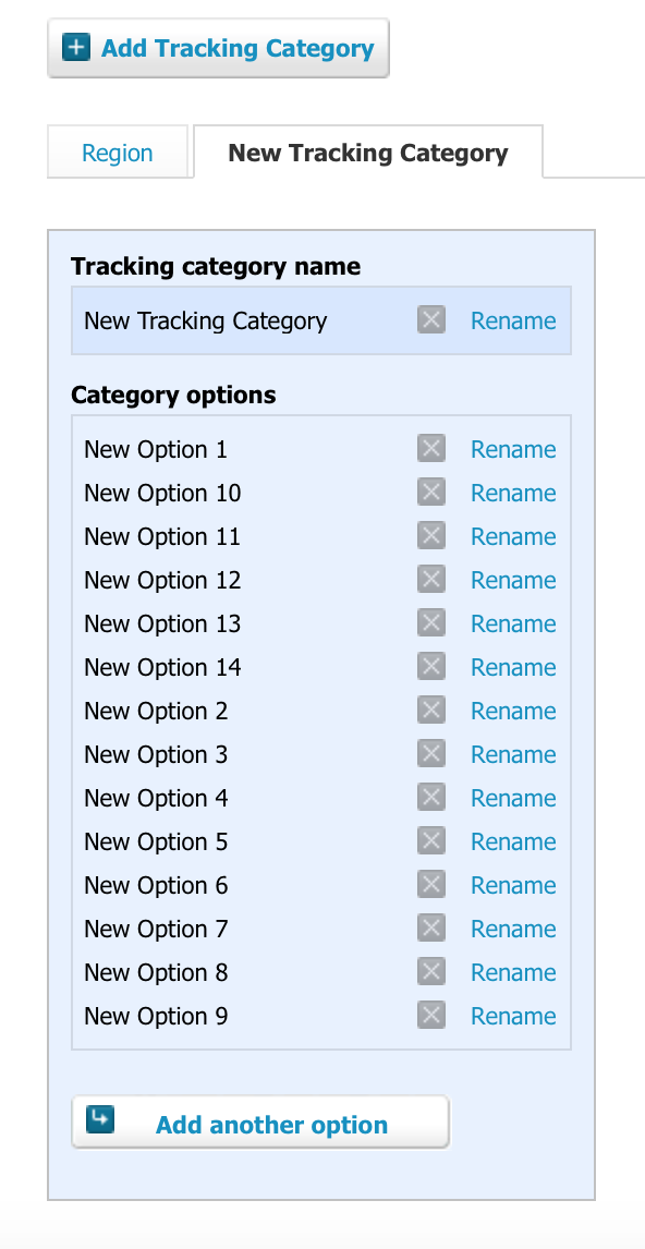Next step is to create a new tracking category "New Tracking Category" in Xero: