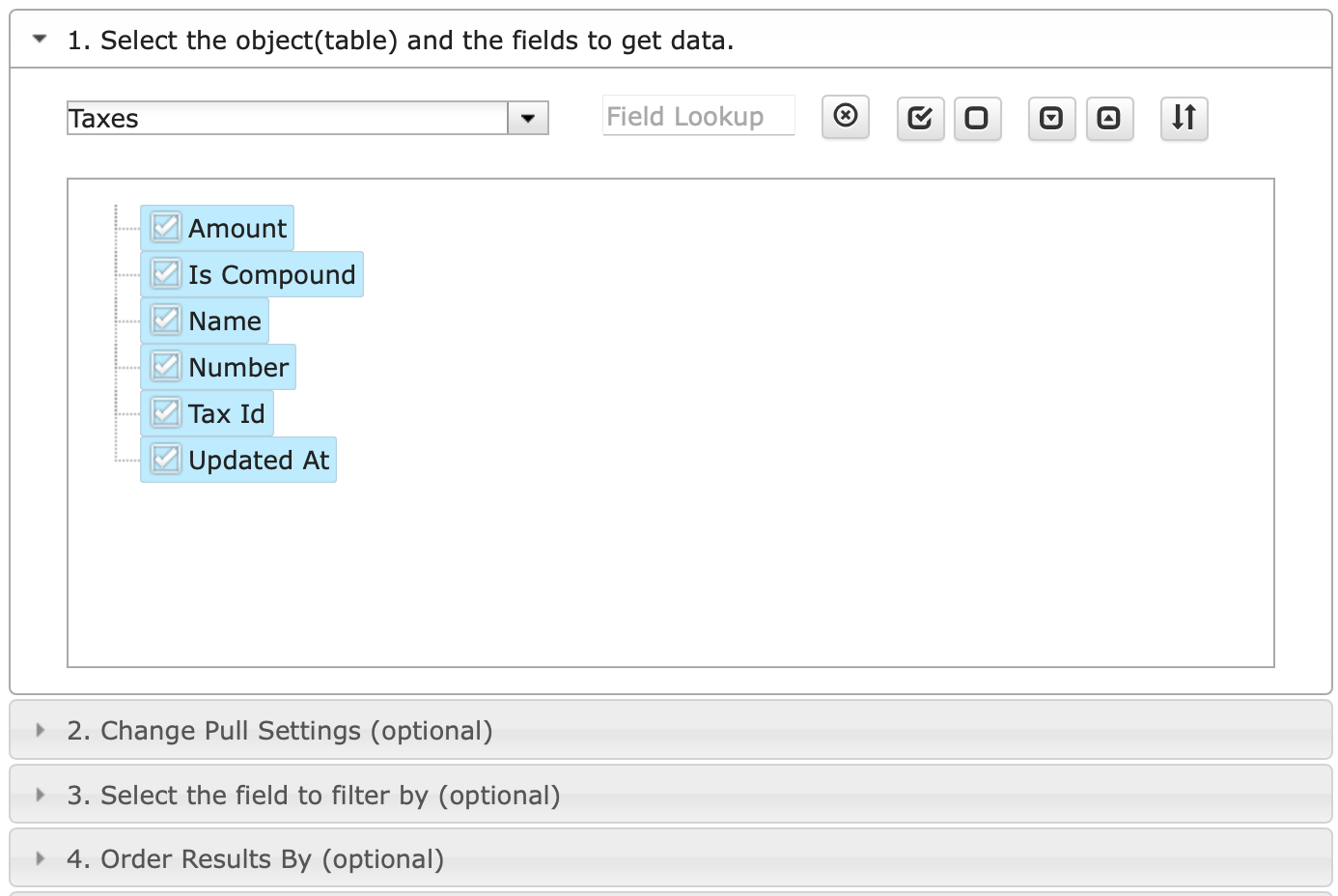 Selectย Taxesย option from the drop down menu. You can select all attributes or some attributes based on your preferences. You can also expend attributes the see the whole structure with sub attributes or collapse it.