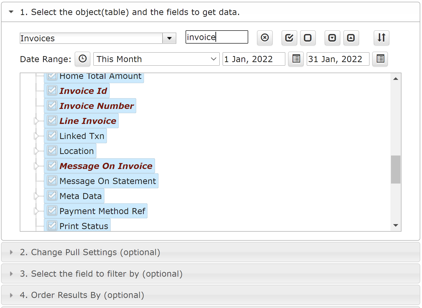 This is one time process. The easiest way to map your data to QuickBooks object fields is to go to Extensions -> G-Accon for QuickBooks -> Reports Designer -> Design Accounting Report, select Invoices object (table) from the drop down menu and all attributes which you would like to upload. This gives you the structure that can be easily mapped and post into QuickBooks account. You can select all or some attributes based on your preferences.