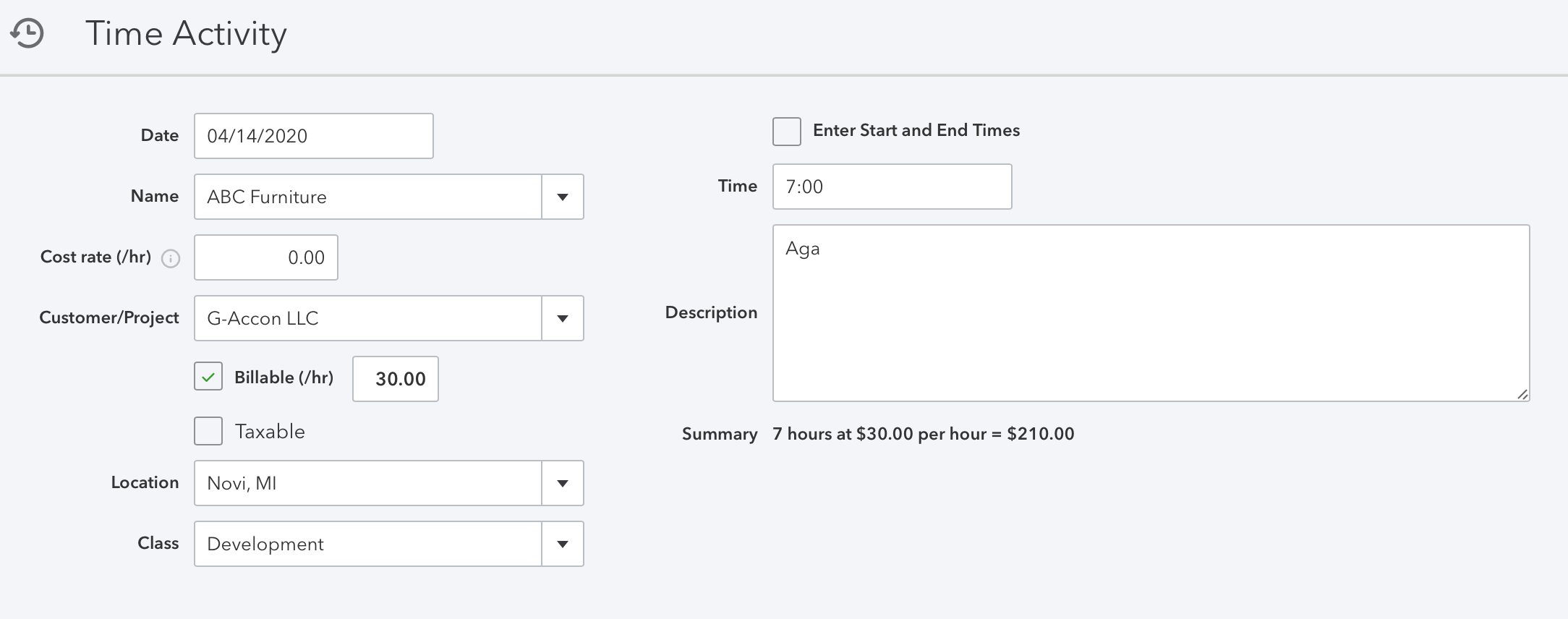Letโs assume we need to create a new deposit record in Google spreadsheet and upload it into QuickBooks. We have entered a new Time Activities with the name, description, type, and so on.
