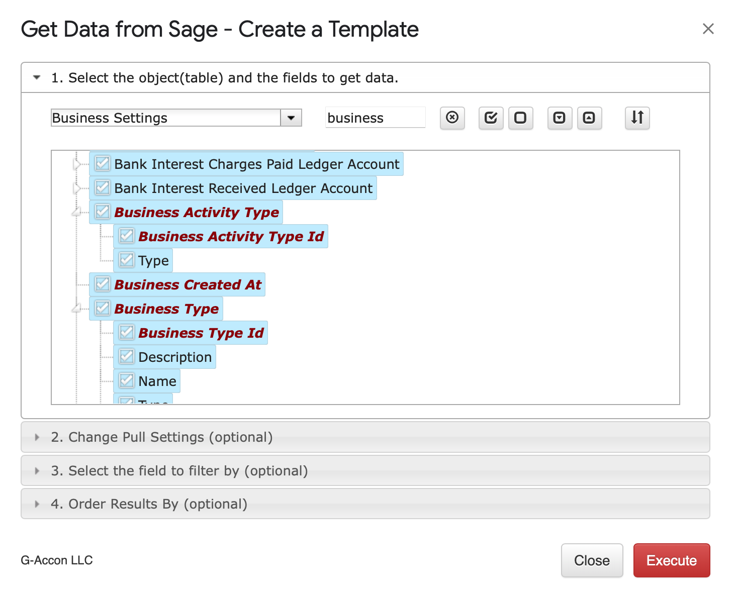 Selectย Business Settings option from the drop down menu. You can select all attributes or some attributes based on your preferences. You can also expend attributes the see the whole structure with sub attributes or collapse it.