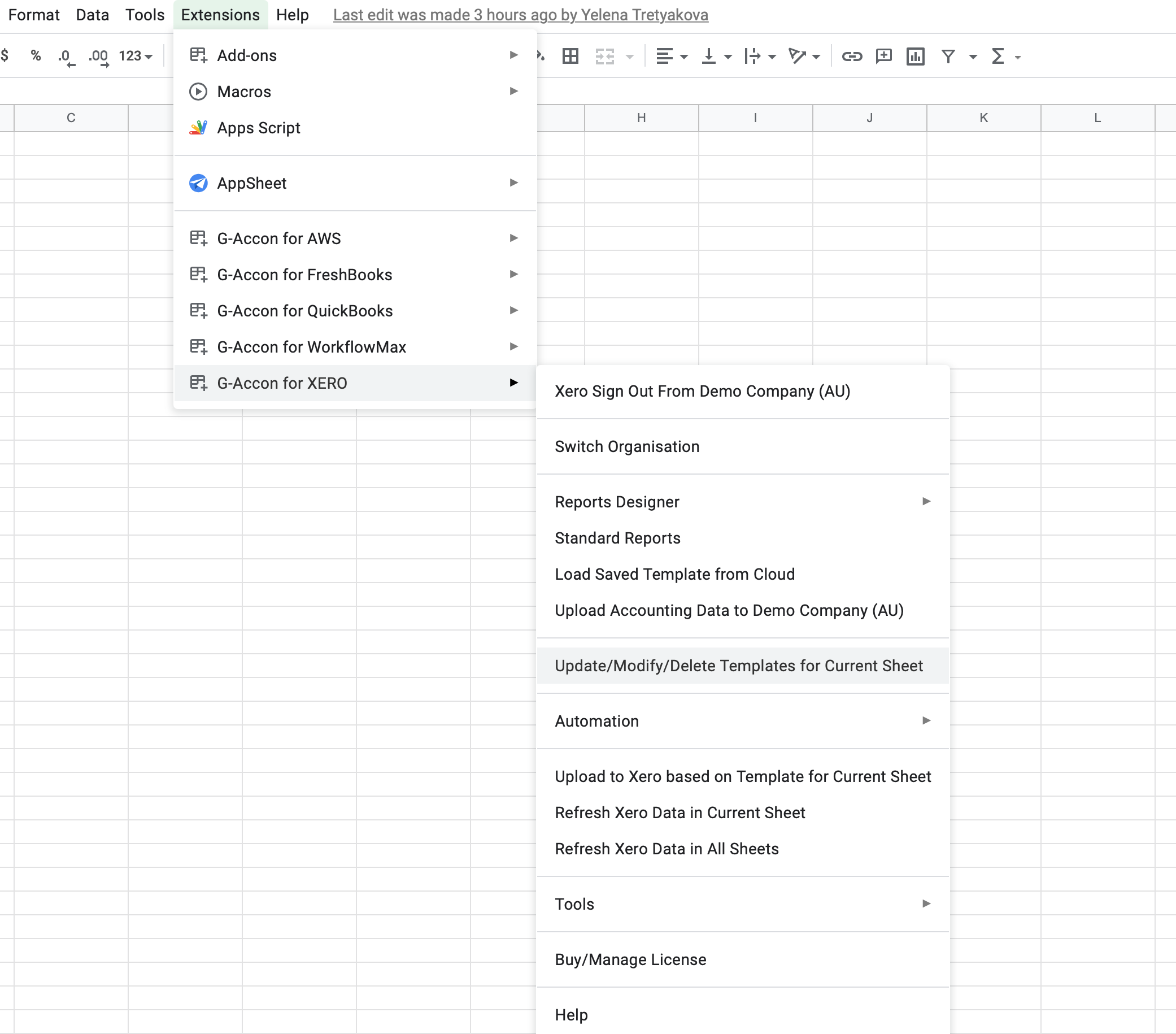 You are in the middle of the refresh process and you realize you need to modify your report. You need to select Extensions -> G-Accon for Xero -> Update/Modify/Delete Templates for Current Sheet