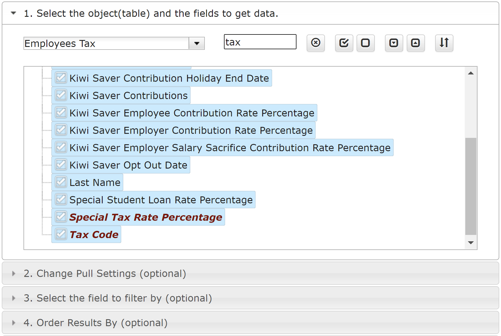 Select Employees Tax option from the drop down menu. You can select all attributes or some attributes based on your preferences. You can also expend attributes the see the whole structure with sub attributes or collapse it.